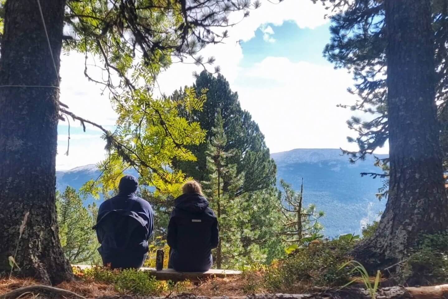 Насладившись видами, отправляемся в обратный путь! К нашей "Смотровой" кедровой поляне!