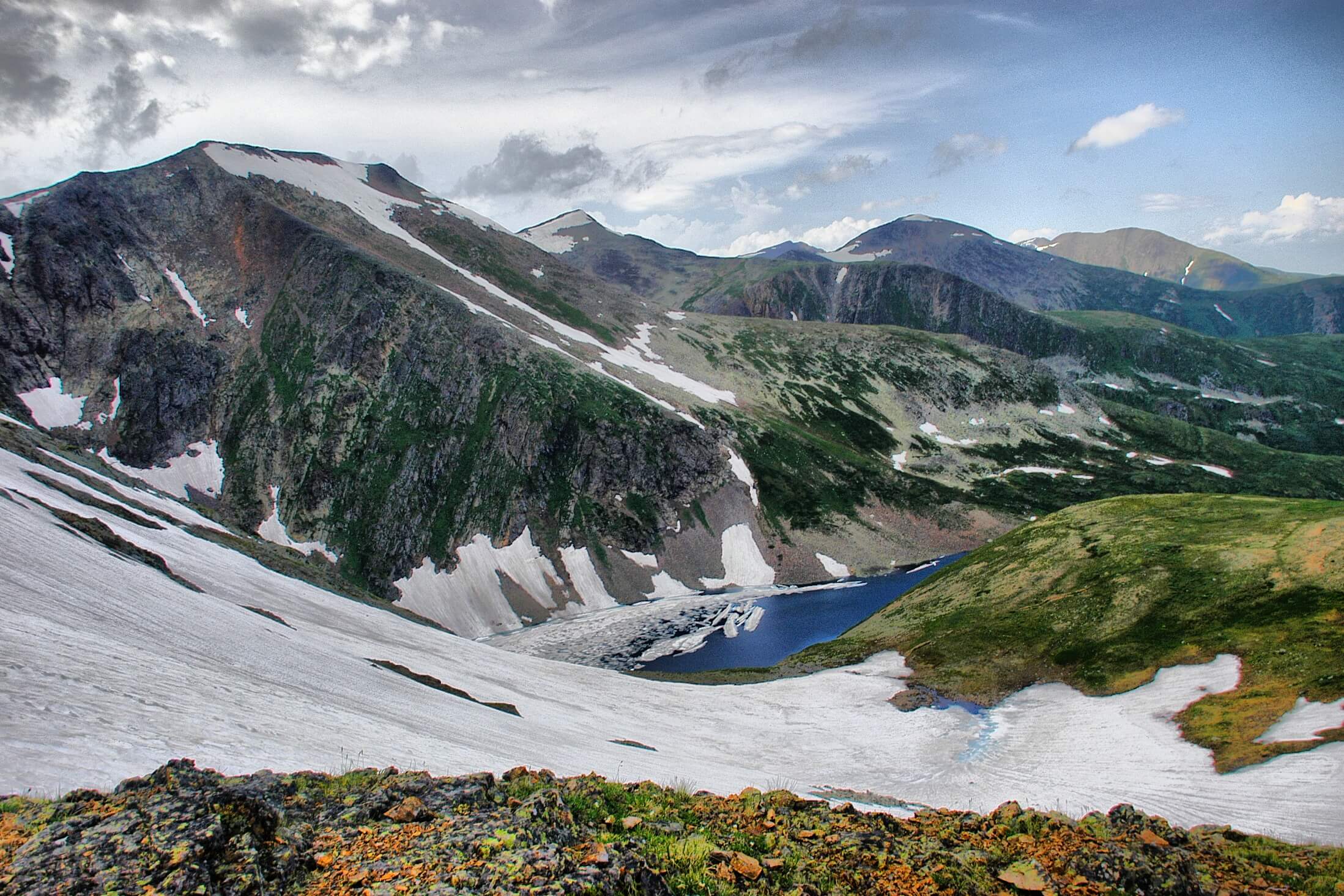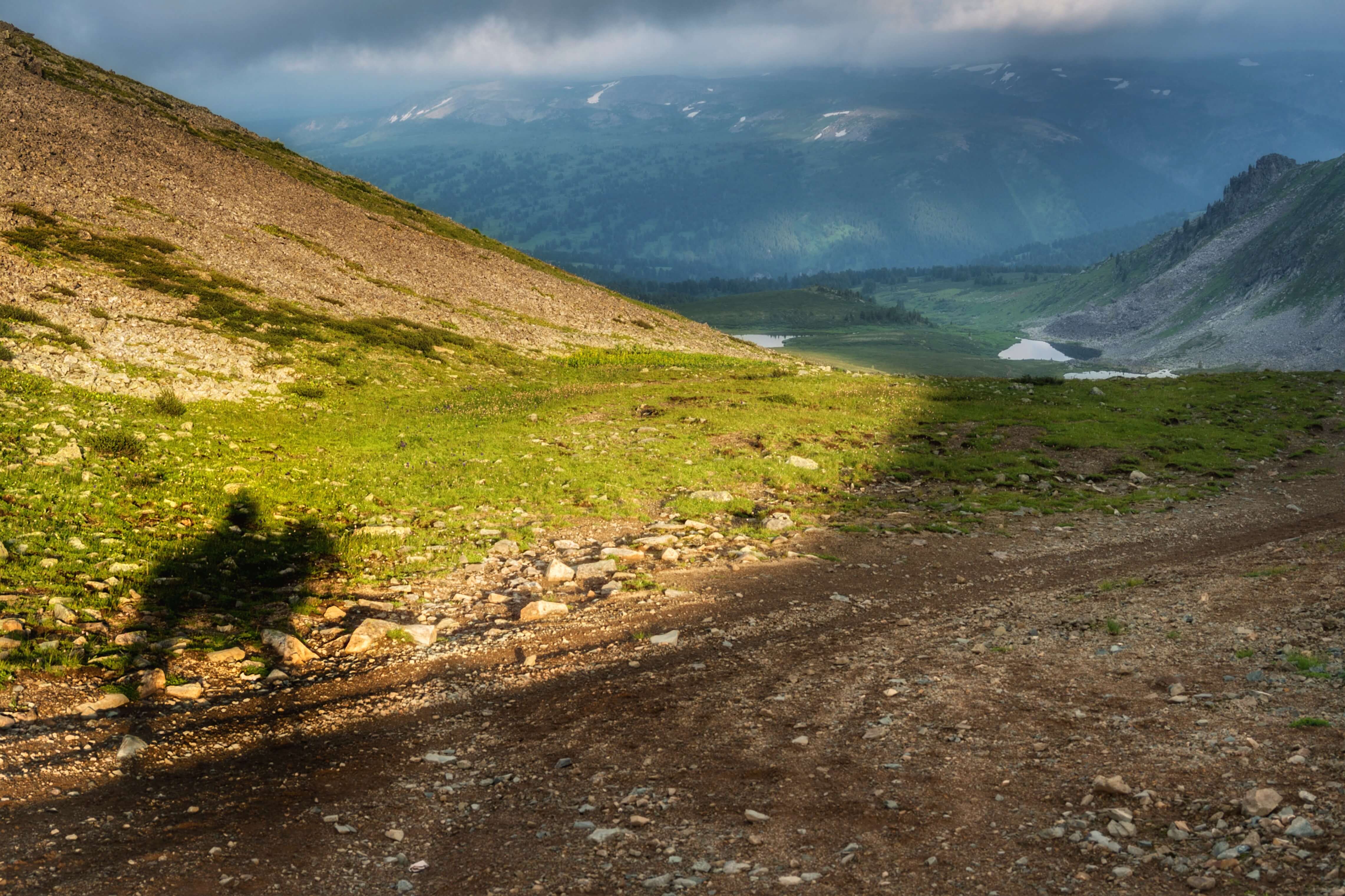 Один из наиболее насыщенных переходов. Он открывает мир сказочного Алтая с сияющими перевалами, извивающимися в дали реками, бескрайними цветочными лугами и заснеженными скалами. Делаем перекус на берегу озера Балыхту и движемся дальше мимо «черной долины» Караербах. С одноименного перевала видно красивейшее «гольцовое» озеро, наполняемое водопадом, но нам мимо - в лог Чевош!