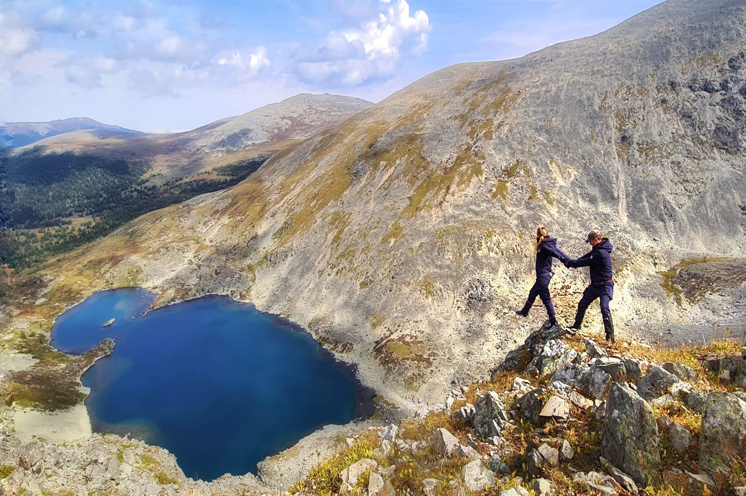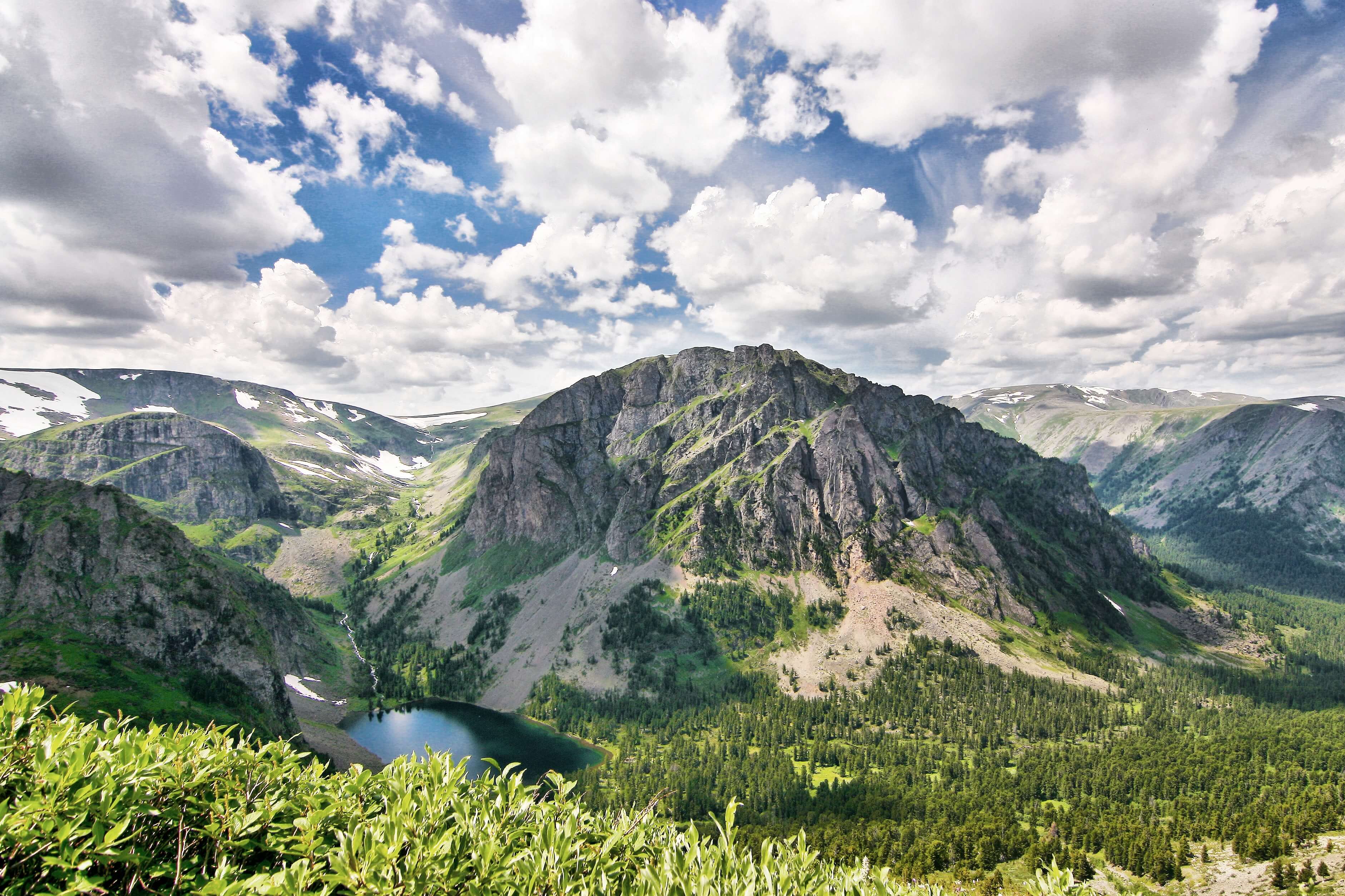 Преодолев несколько перевалов, проходим мимо ледникового лазурно-бирюзового озера и поднимаемся на самый высокий перевал Уймень (2600 м.), где непременно нужно сделать остановку, чтобы полюбоваться на озеро–сердце и озеро Уймень с высоты птичьего полета. Чудесный вид, а нам, да-да, туда - в сааааамый низ! Головокружительный пеший спуск и мы у озера. Тут, кажется, совсем дико, редко бывает человек, а в мыслях звучит: «Ведь создал Бог такую красоту...»
