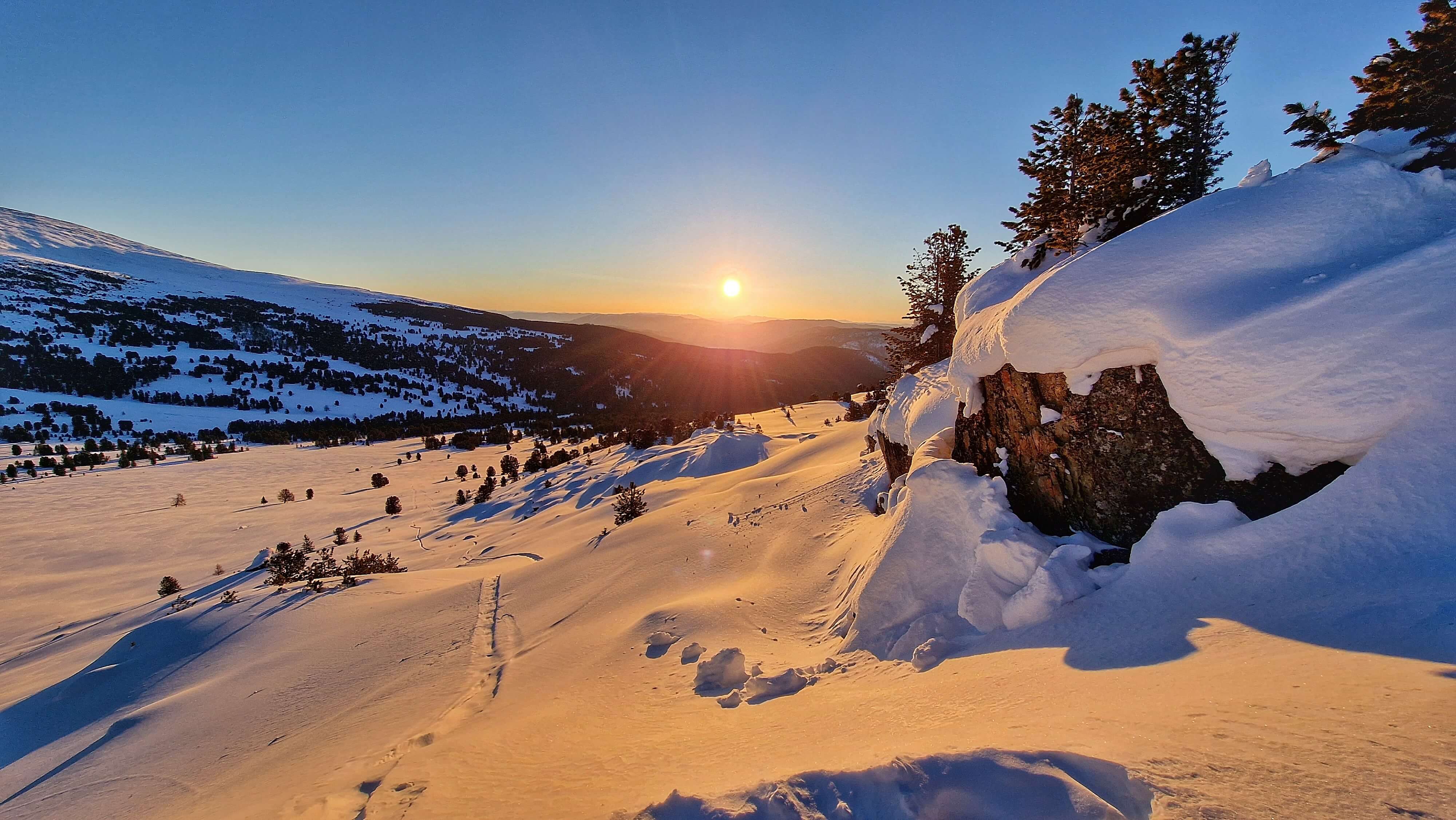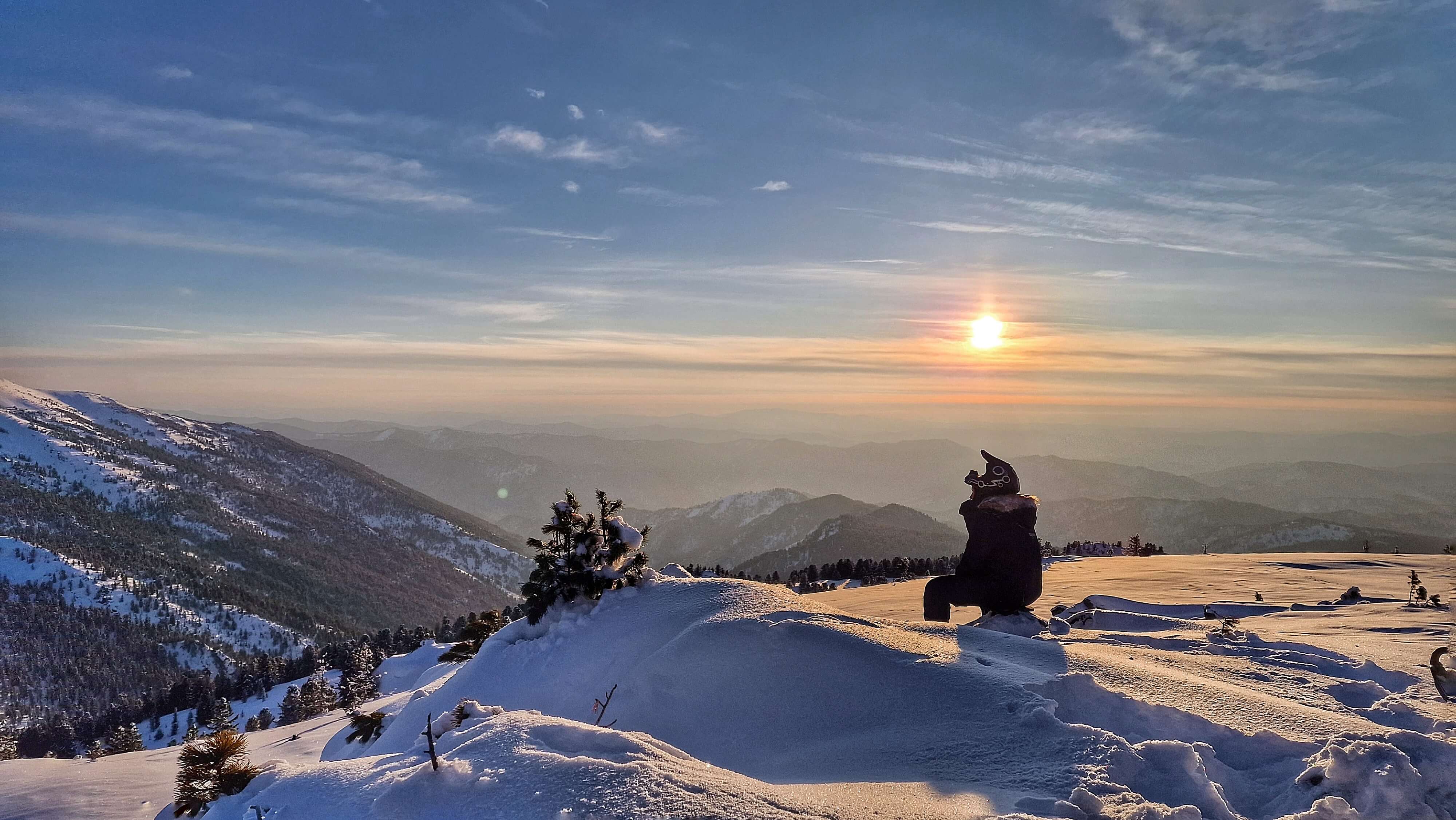Вперед! Вдоль лесной дороги мы неспеша, нарабатывая навык управления снегоходом, движемся к первой видовой площадке - перевалу Караташ, откуда открывается чудесная панорама мест, в которых мы можем быть уже, буквально, через 2 часа. Перспектива горных вершин и перевалов Каракольский белок и Багаташ впечатляет. "Неужели нам туда?" - звучит в голове в унисон с двигателем снегохода.