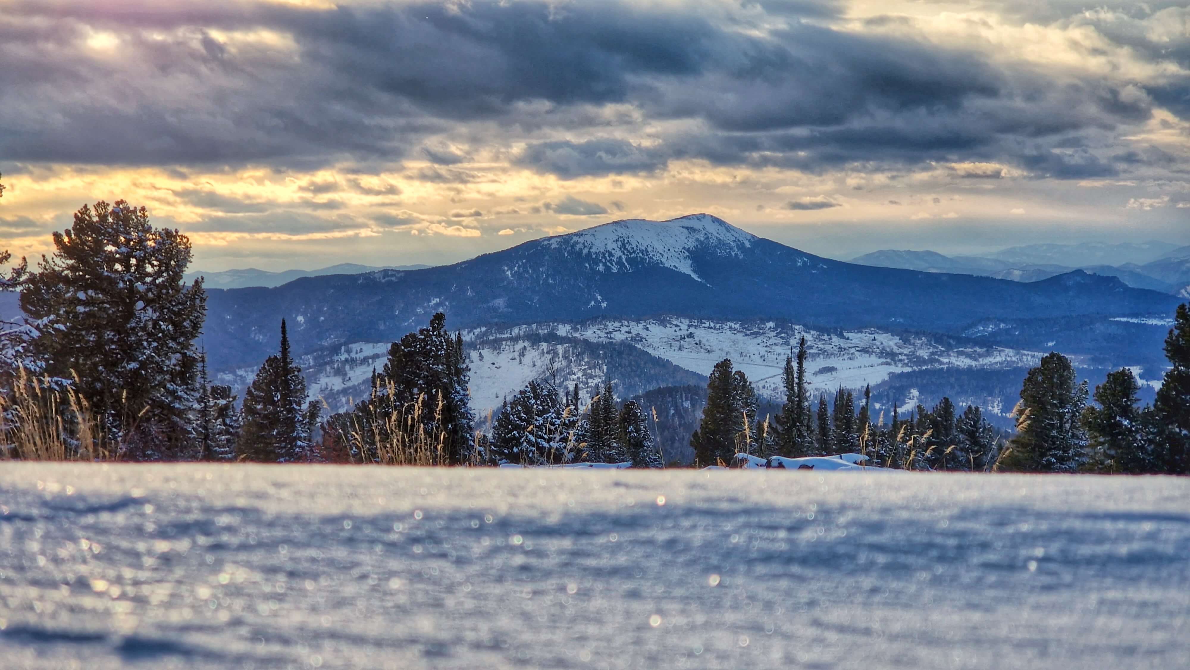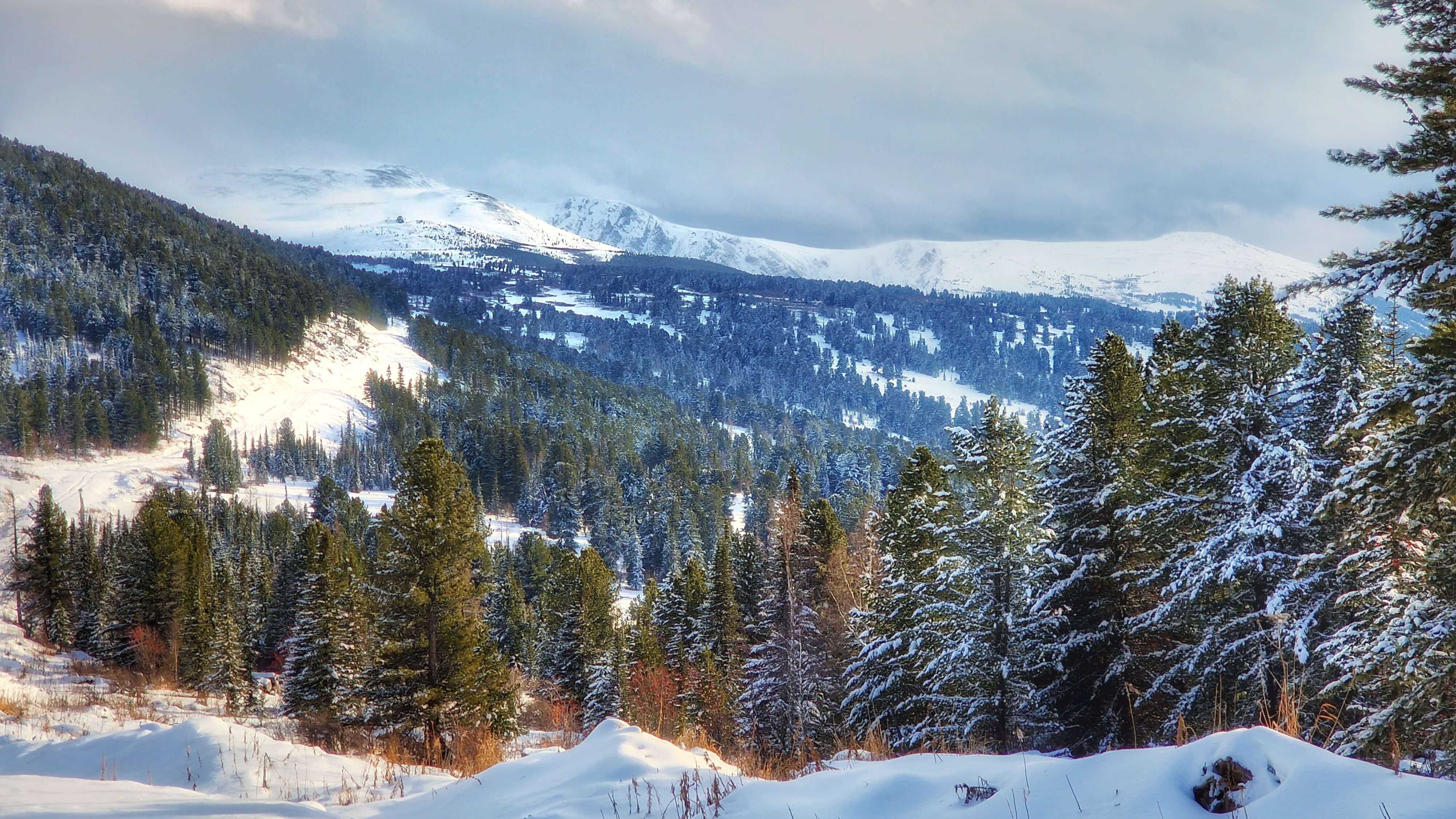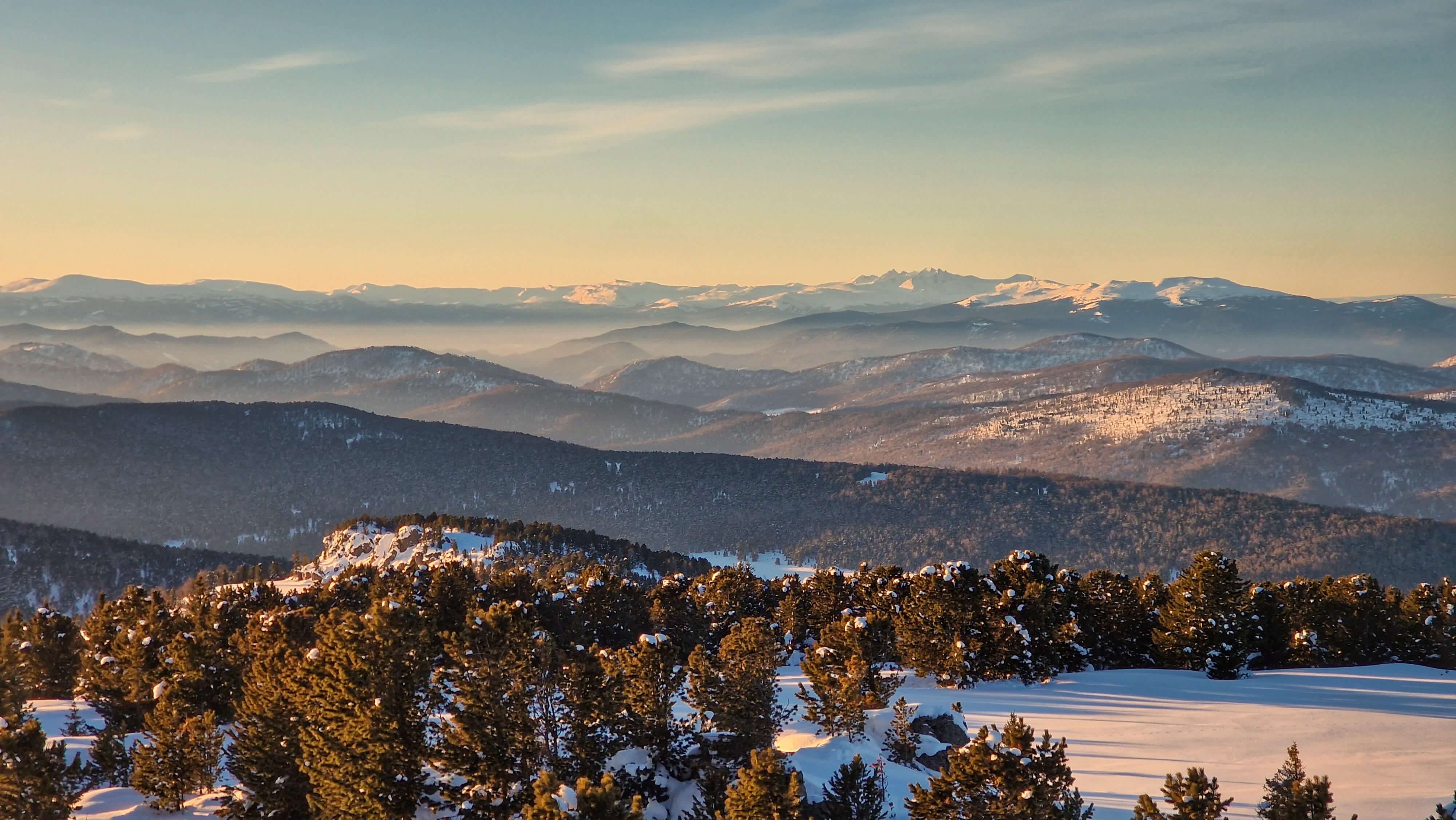 Трасса маршрута постепенно усложняется - нам необходимо преодолеть предгорные заснеженные поля, чтобы оказаться на финишной прямой - Кылайской горной гряде. Сосны и береза сменяются густым кедрачом, воздух становится ощутимо морознее, но суше, а виды грандиознее. Выезжаем снова на лесную дорогу, с которой открывается великолепная перспектива на горные хребты. Наши бывалые туристы эту картину часто называют "Море тайги". А почему бы и да?