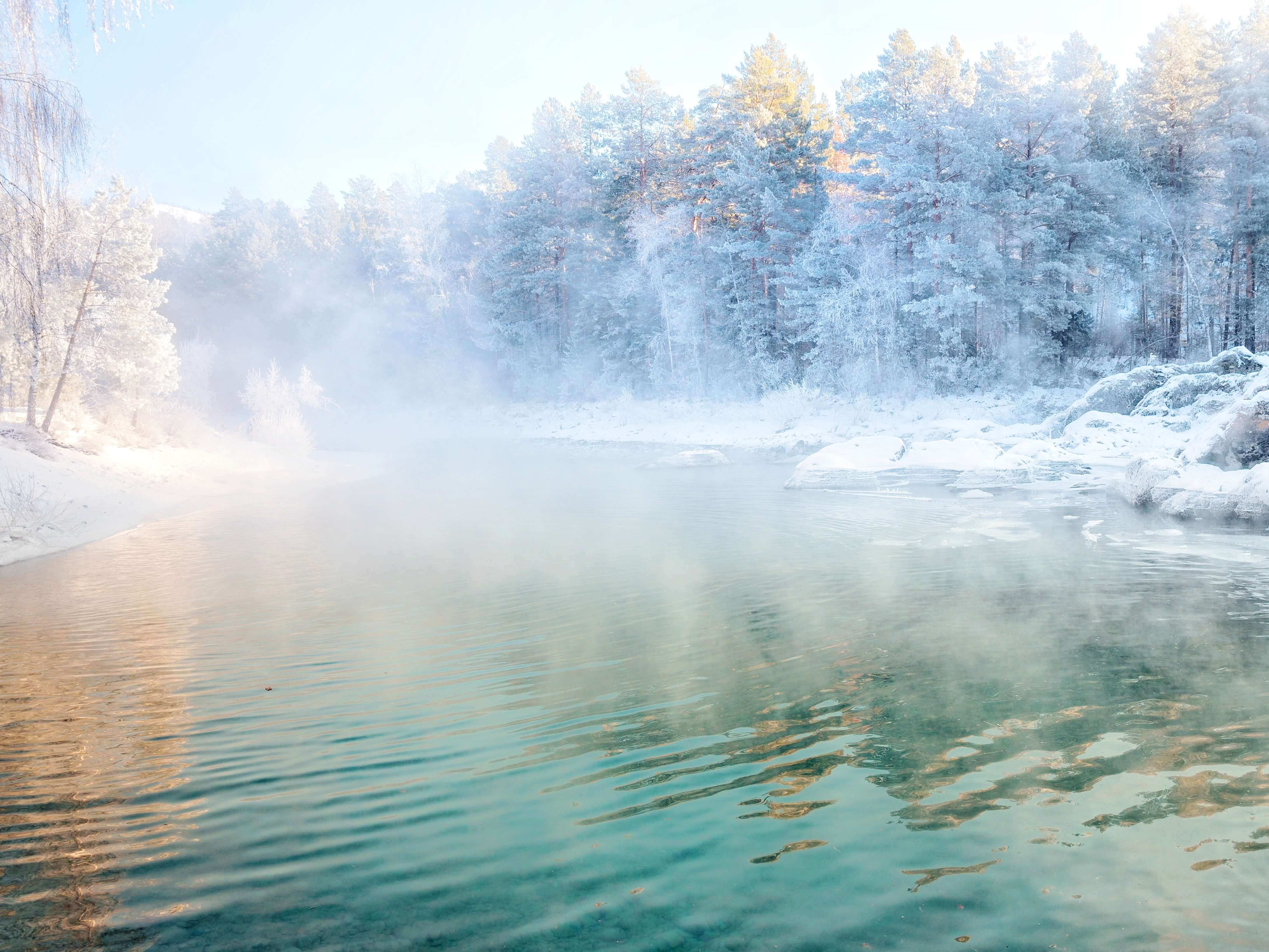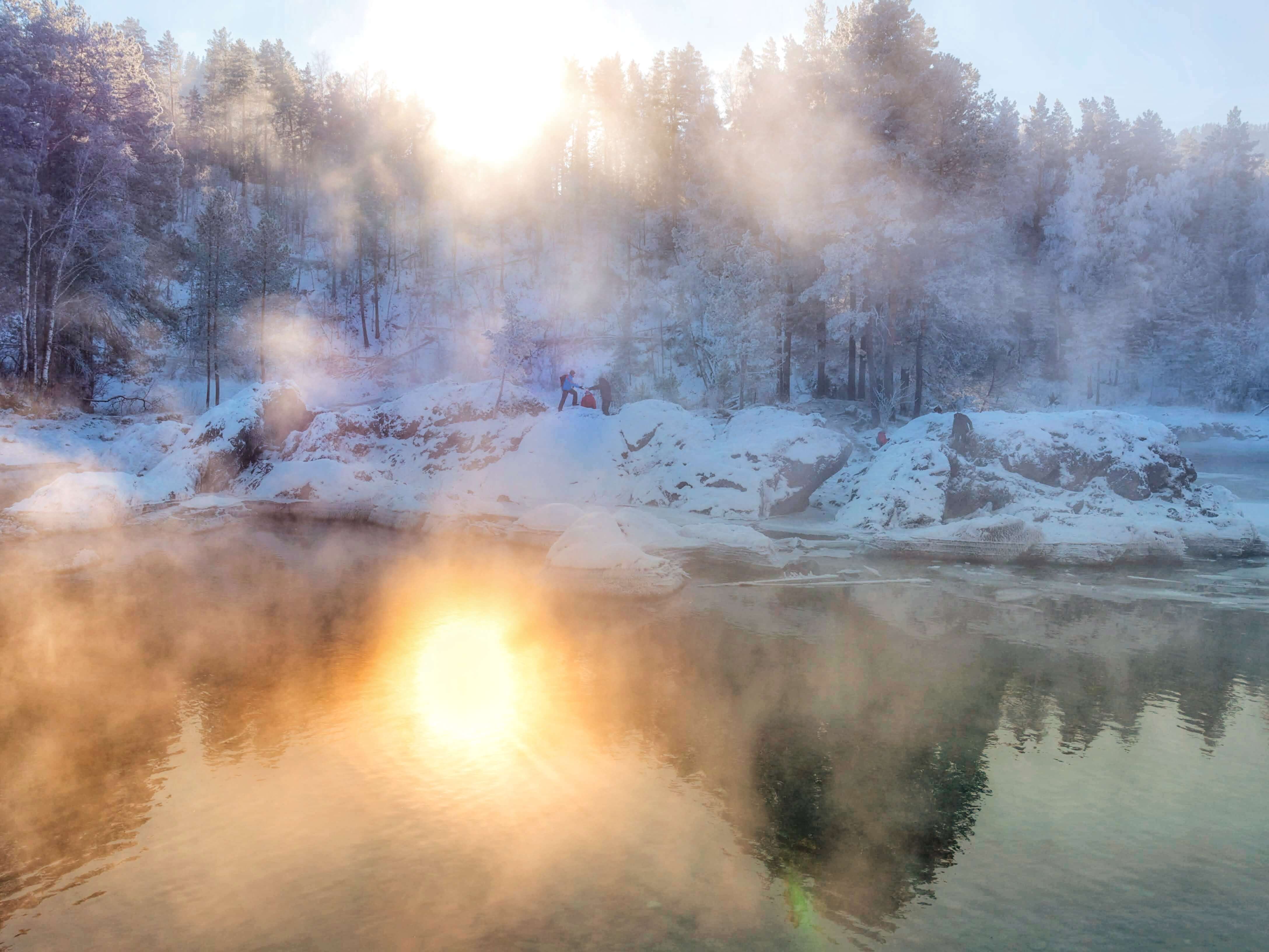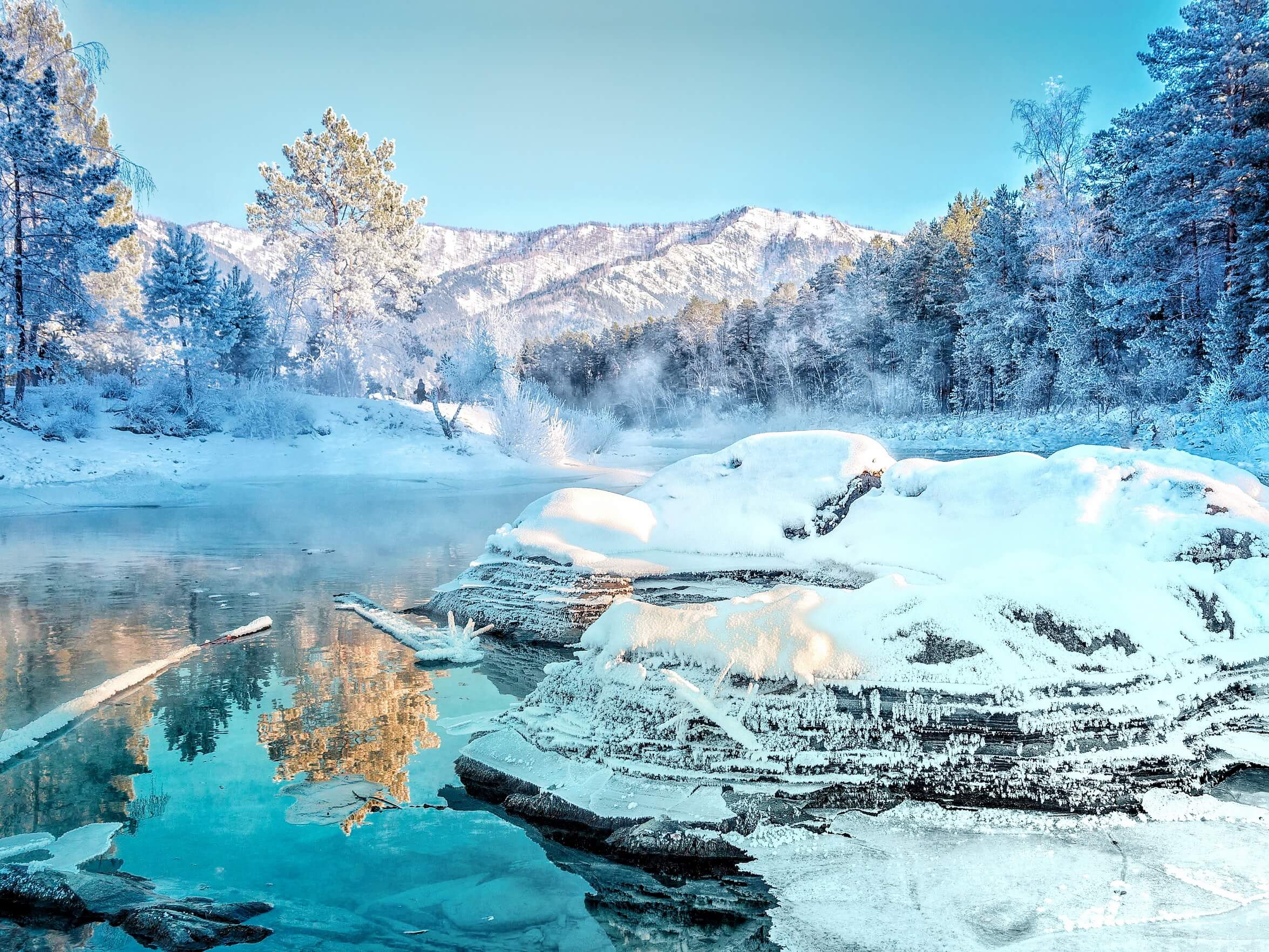 Чтобы добраться до водопада - совершим пешую прогулку вдоль зимнего берега Катуни, впитывая ароматы сосен и любуясь сверкающим лесом.